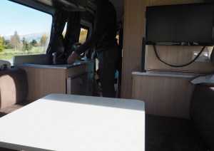 Nous sommes arrivés en Nouvelle-Zélande. Là-bas nous avons loué un camping-car. Il est très grand. Dedans il y a : deux lits transformables, une cuisine, des toilettes, une petite douche, un barbecue, une table avec banquettes et une table de camping.